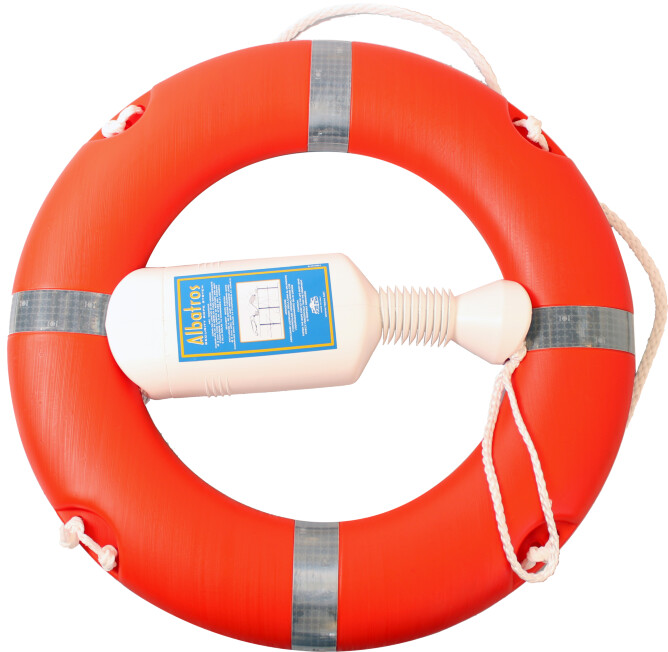 Orange livbøye med standard holder og 30 m kasteline. Kastelinen har en diameter på 8 mm, opptil 600 daN bruddstyrke og er internasjonalt godkjent til livredningsbruk (SOLAS). Holder for livbøyen følger med.