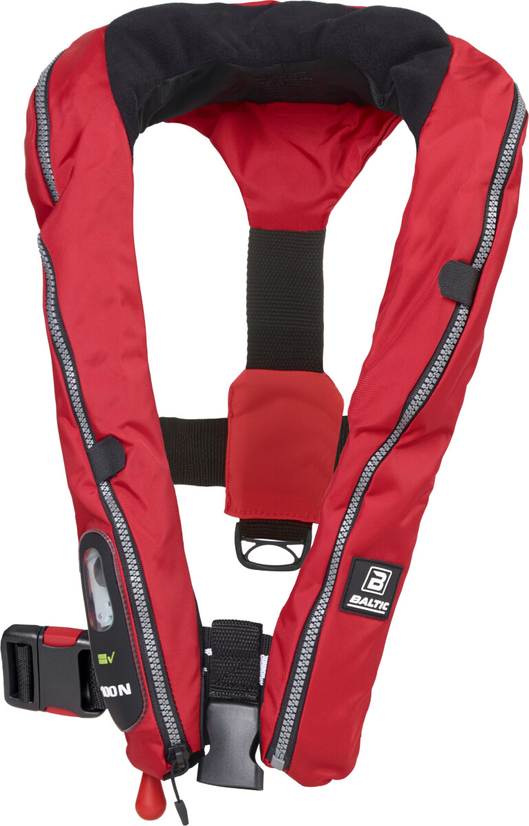 Baltic Compact 100 er en superlett og svært smidig automatisk oppblåsbar redningsvest. Den legger seg mykt rundt nakke og bryst, og kan knapt føles. Vesten har sentrert skrittstropp, og en brukervennlig hurtigspenne på beltet. Nederst på siden har den et vindu som lar deg sjekke om vesten er armert, og klar til å kunne utløses.Noe mindre kammer gjør Compact 100 best egnet til relativt rolige farvann.