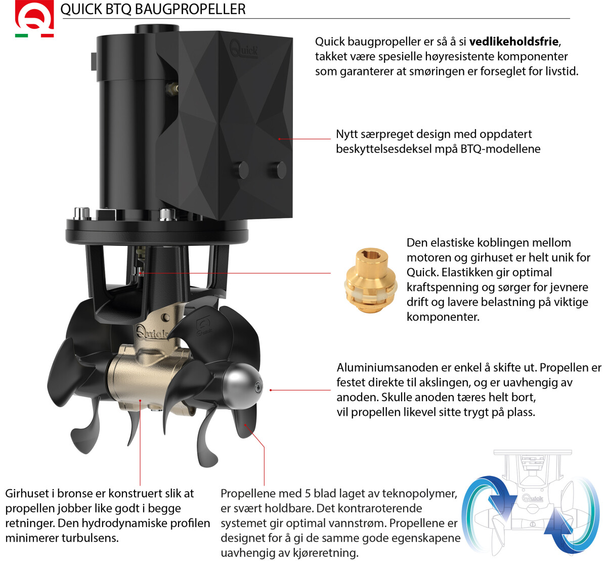Quick BTQ baugpropeller er så å si vedlikeholdsfrie. Det eneste du trenger å gjøre er å bytte ut aluminiumsanoden ved behov. Girhuset i bronse er ekstremt holdbart, og har tetninger som holder på smøringen gjennom hele systemets levetid. Du trenger derfor aldri å smøre eller å bytte olje.
