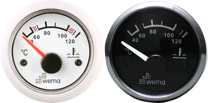 Instrumentet viser vanntemperatur i motorens kjølesystem. Koples til Wemas temperaturgivere, STP/SNP. Rød eller gul bakgrunnsbelysning. Vanntett (IP=56). Resistent mot UV, ozon og saltvann. Korrosjonsbestandig.