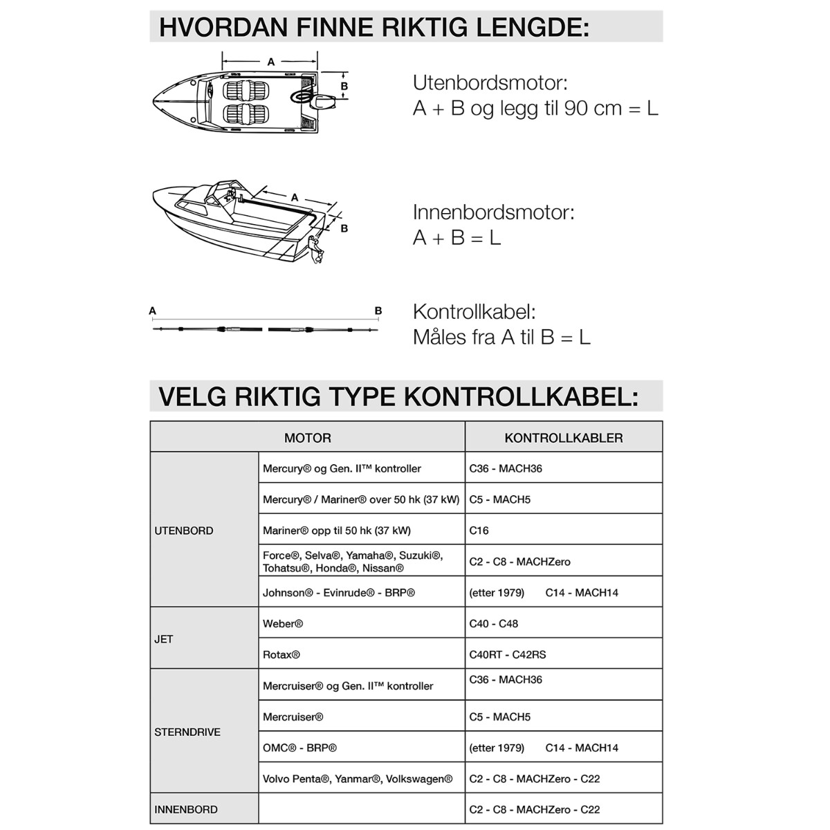 Kontrollkabel med svært lav friksjon og høy fleksibilitet for presis og komfortabel styring.Den passer til Yamaha, Suzuki, Tohatsu, Honda, Force, Selva og Nissan utenbordsmotorer, samt Volvo Penta hekkaggregater, Yanmar og Volkswagen innenbordsmotorer.
