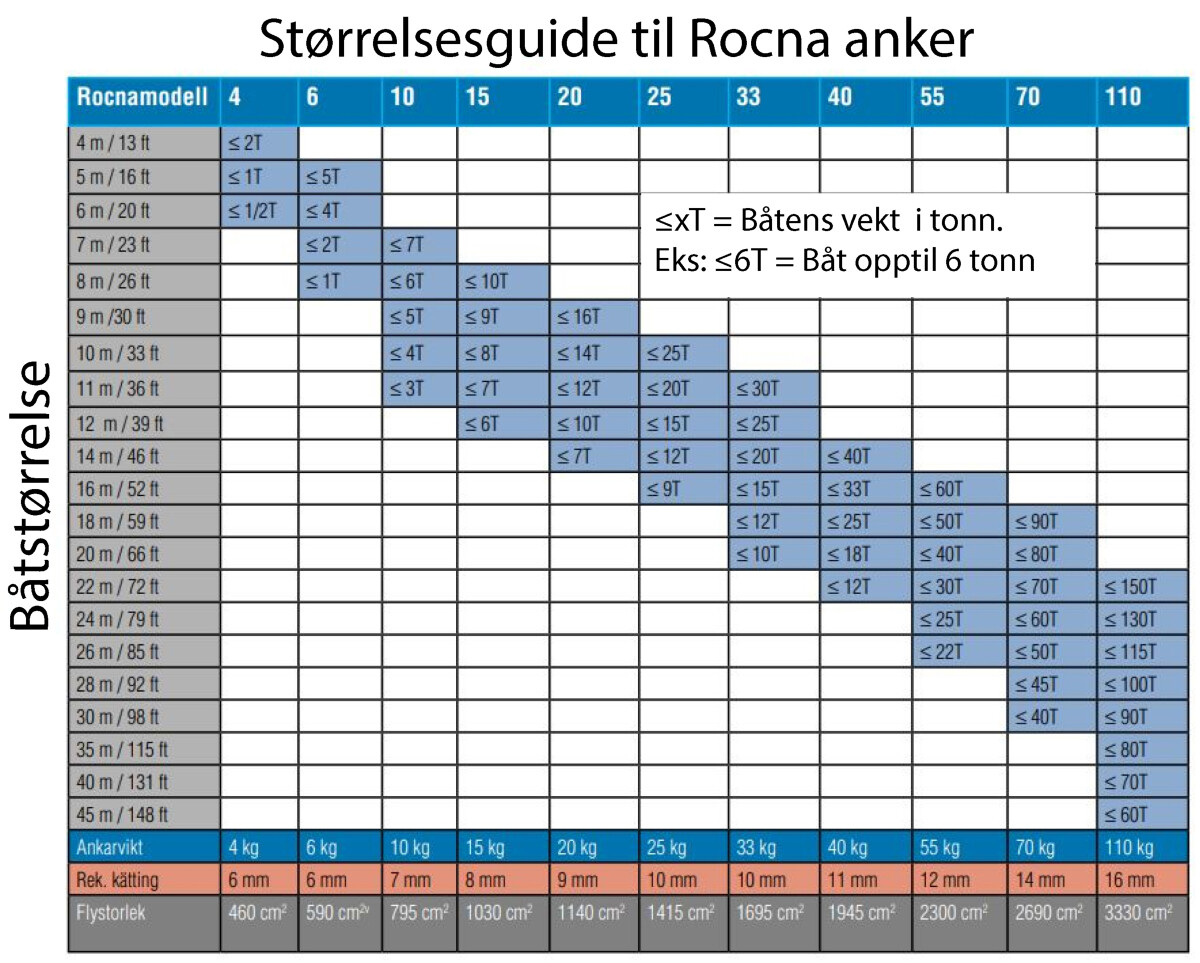 Ankeret har livstidsgaranti og har gjennom tester verden over bevist at den graver seg raskest ned i alle bunntyper, og holder med svært stor kraft. Rocna anbefaler en kort kjetting inntil ankeret. Alle Rocna anker har livstidsgaranti mot brudd.Antatt størrelse på anker er alltid ut fra en gjennomsnittsvekt på båttypen. Verdiene i tabellen er fastsatt ut i fra 25 m/s og bløt bunn.