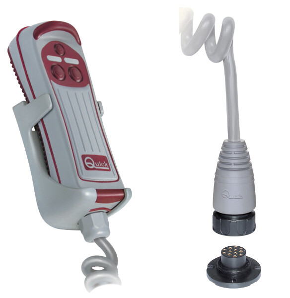 Vanttett (IP=67), håndholdt fjernkontroll fra Quick med 2 knapper/funksjoner. Fjernkontrollen kan brukes til mange operasjoner ombord i tillegg til ankervinsj, som kran, stige eller bro. Den er solid kontstruert, og er forsterket med gummi som gir et godt grep, lang holdbarhet og perfekt vannbeskyttelse.