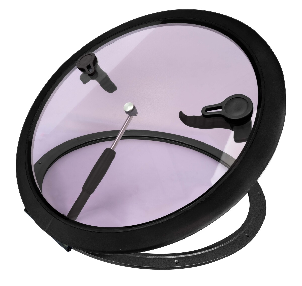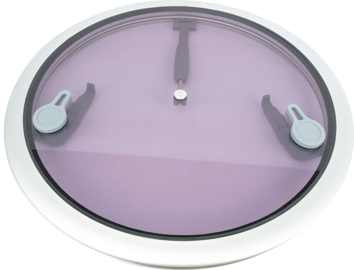 Flott rund dekksluke i aluminium fra 1852 i lys og sort farge. Luken kan låses i valgfri posisjon og åpnes 90 grader.