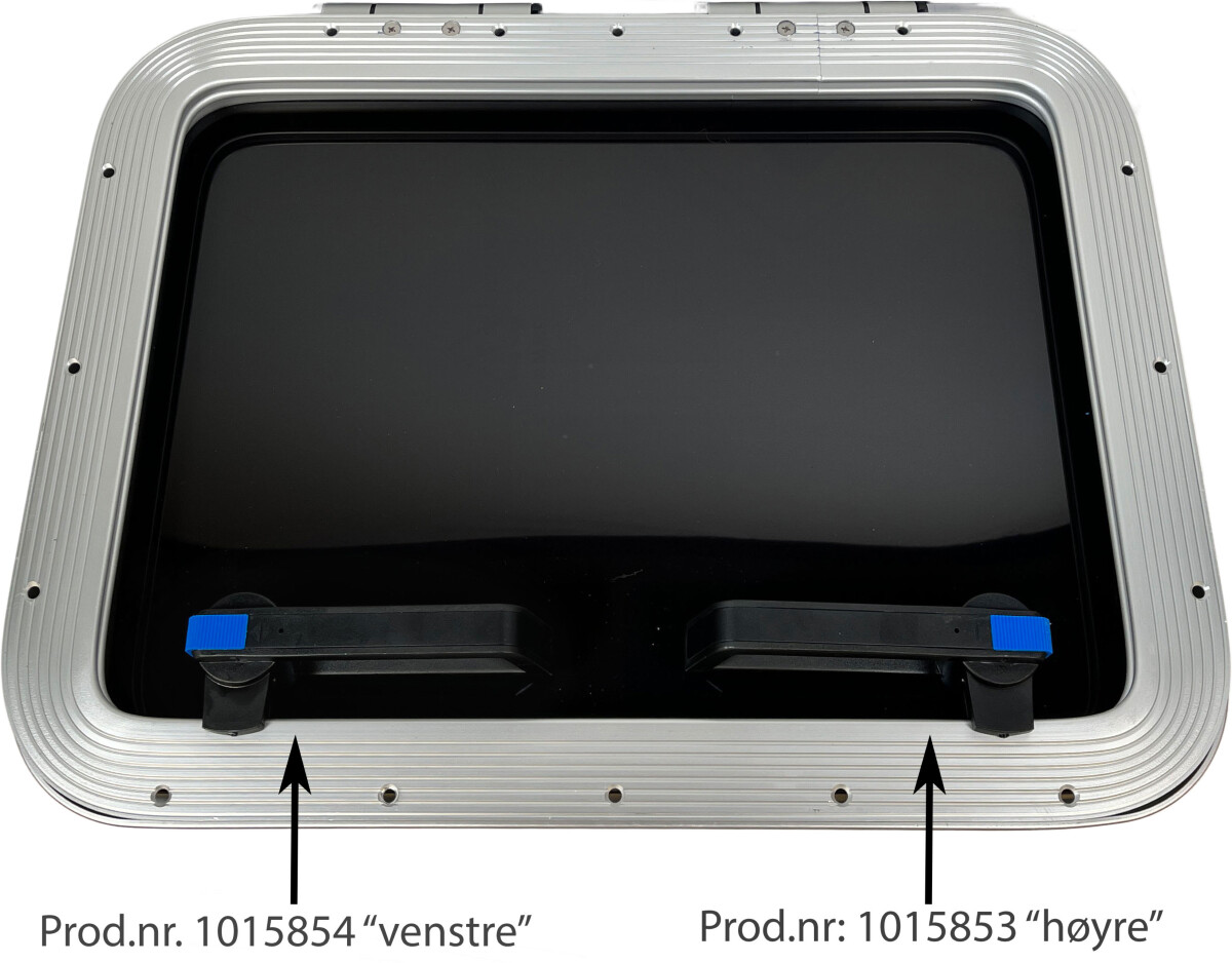 Komplett håndtak til GEBO skylight. Se bildene for forklaring av variantene "høyre" og "venstre". Håndtakene er merket med R (høyre) og L (venstre). Er du i tvil om hvilket du trenger, kan du ta en titt på ditt gamle håndtak.
