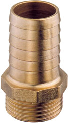 Slangekopling "han" med utvendige rørgjenger og slangestuss. Laget i messing. ISO 228/1 (BS 2779).