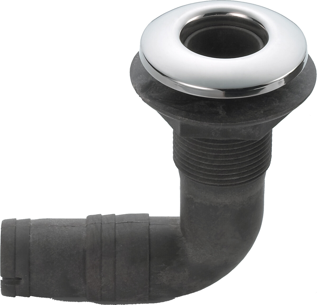 Skroggjennomføring 90° med slangekopling. Laget i nylon med deksel i syrefast stål 316.
