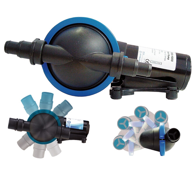 Stillegående membranpumpe og helt korrosjonsbestandig lensepumpe. Trenger ikke filter. Meget fleksibel montering. Selvsugende opp til 3 m. Kapasitet på 16 liter per min. Beregnet for bruk inntil 30 min. 10A.