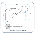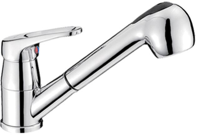Pent forkrommet blandebatteri med ettgreps regulering av temperatur og vannstrøm. Blandebatteriet har uttrekkbart dusjhode med 150 cm slange.