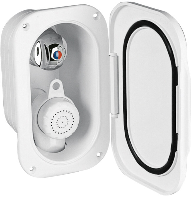 Komplett dusjboks med lokk med tett pakning. Dusjboksen har integrert blandebatteri, og dusjhode med enten 3 eller 5 meter lang slange. Den egner seg svært godt til montering på badeplattformen.